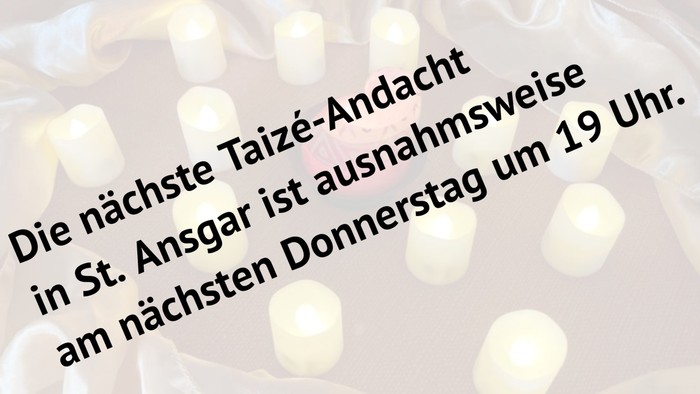 Ausnahmsweise findet die Taizé-Andacht im April und Mai jeweils am dritten Donnerstag statt - also am 16. April bzw. am 21. Mai.