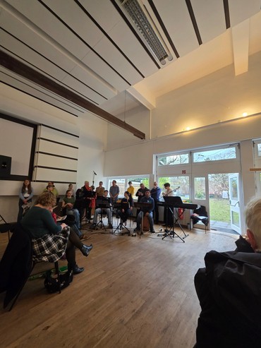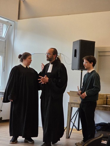 18 Uhr: Praktikant und Pfarrteam sind bereit, der Gottesdienst mit Bandbegleitung kann beginnen.